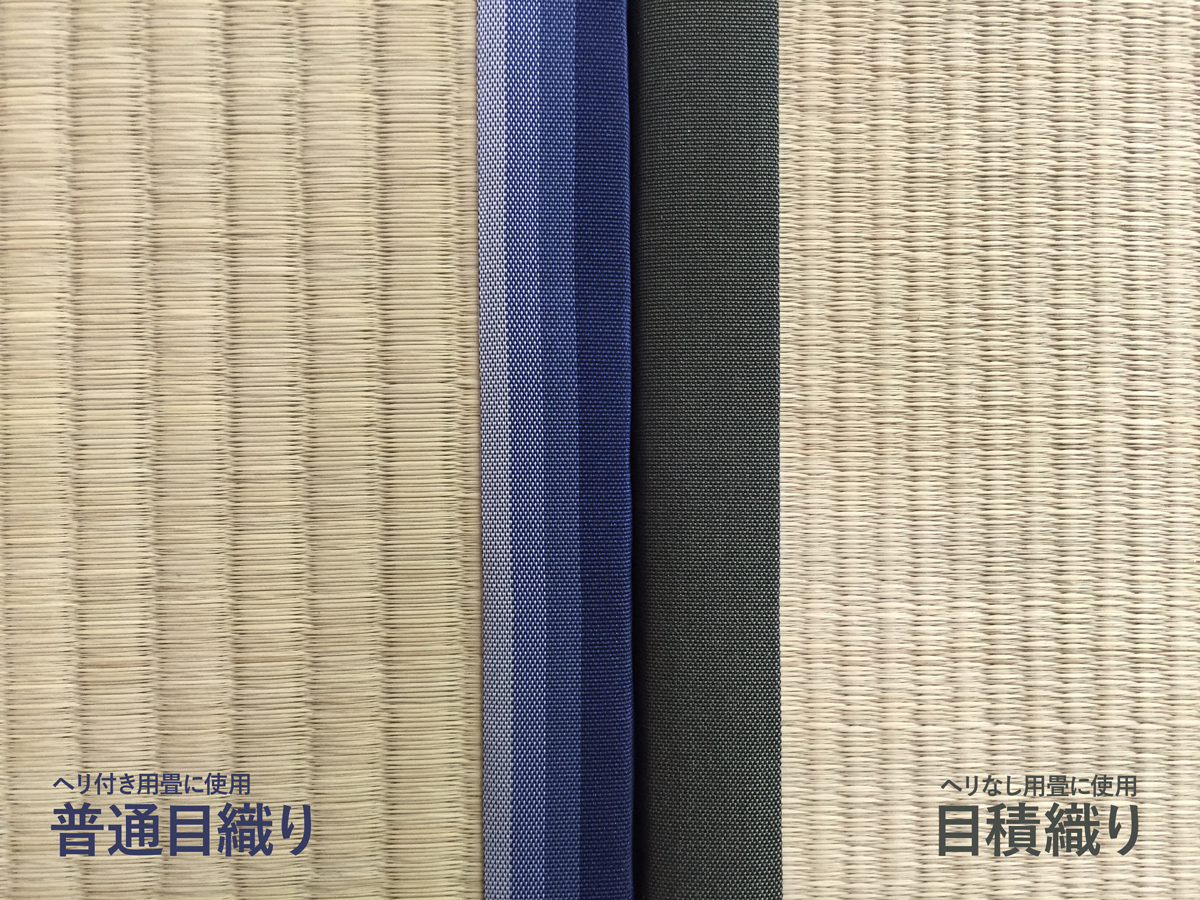 - ヘリ付き用畳表とヘリなし用畳表の織り方の違いを写真で確認できます。